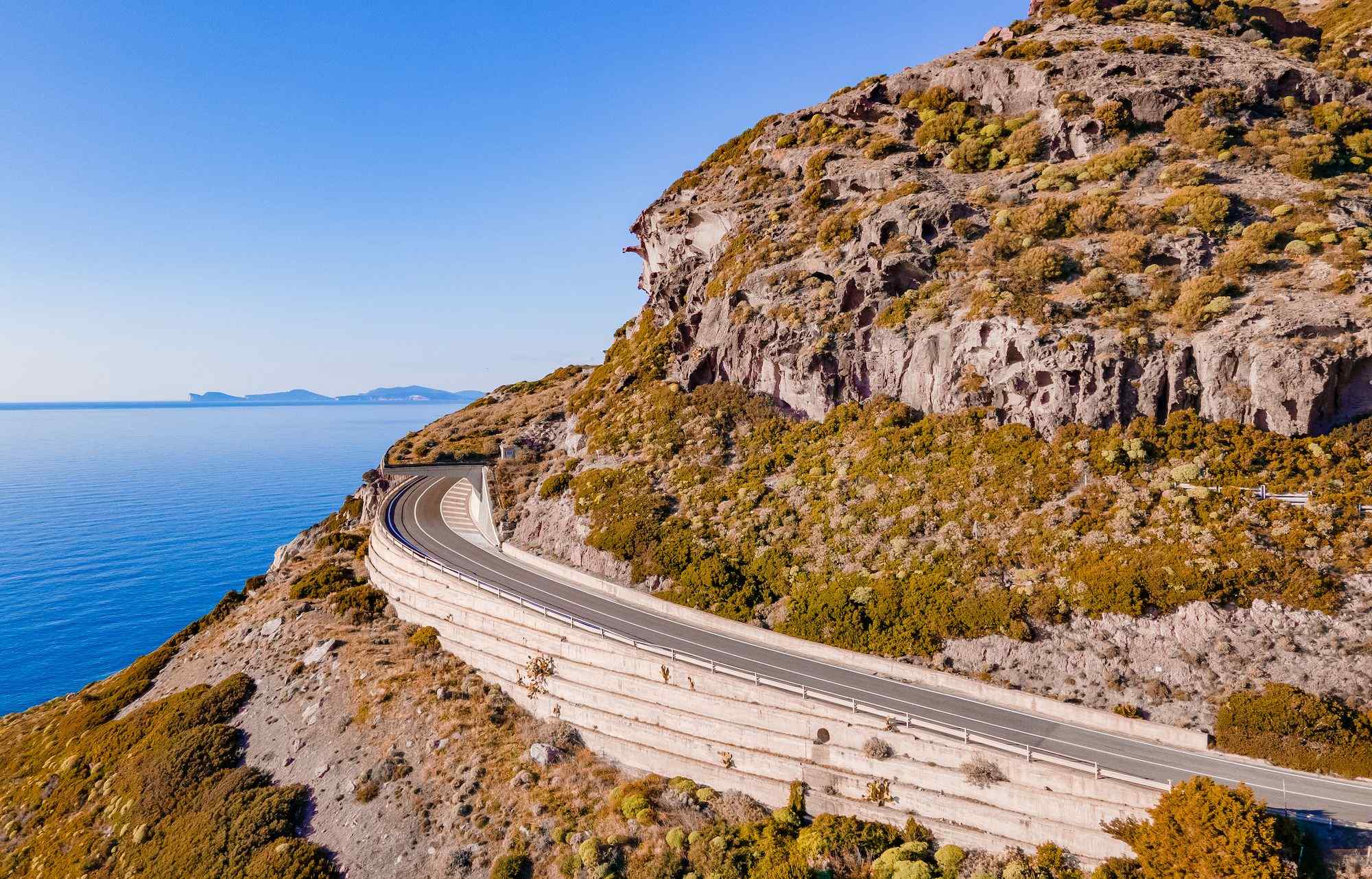 Tratto iconico della SS125 Orientale Sarda tra mare e montagne.